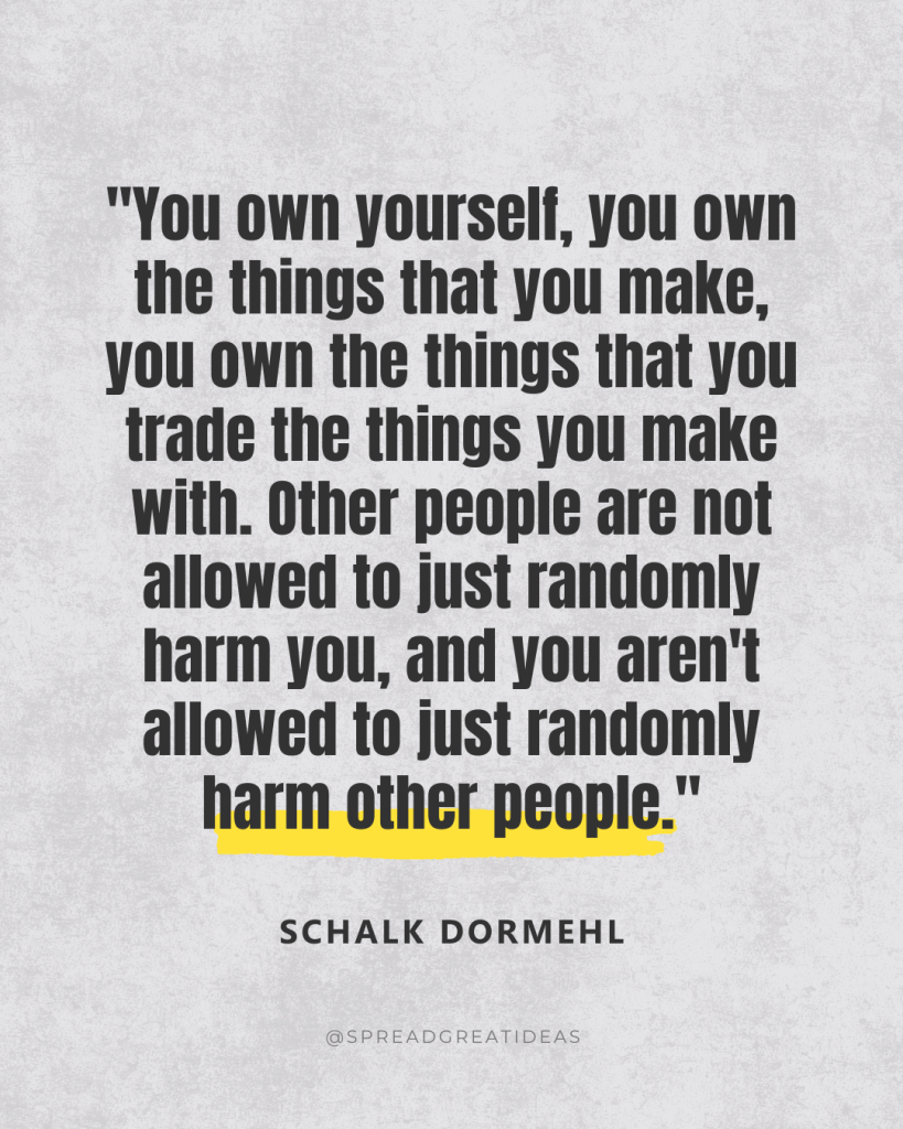 “You own yourself, you own the things that you make, you own the things that you trade the things you make with. Other people are not allowed to just randomly harm you, and you aren’t allowed to just randomly harm other people.”