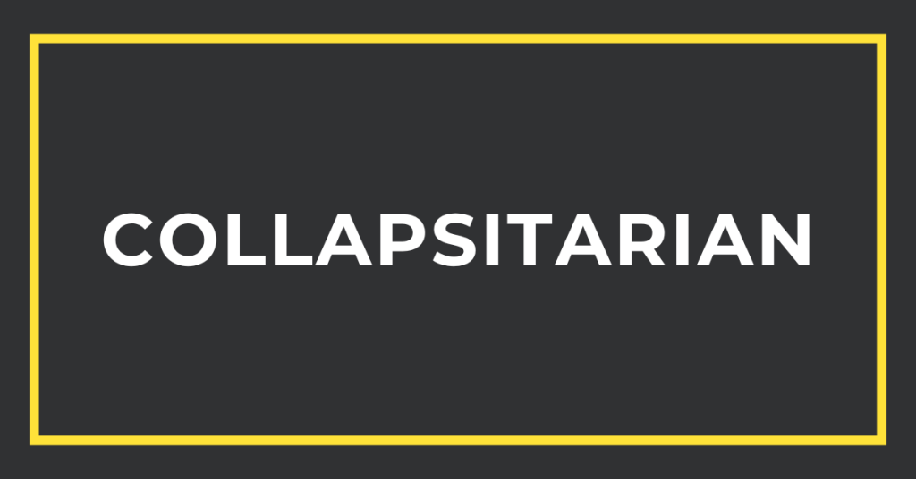 A collapsitarian is a person who believes in the inevitability of socio economic collapse of the world as we know it. They do not yearn from it, but are simply accepting it.
